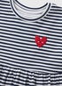 For an effortlessly stylish look, choose our girls white striped dress. It features a timeless striped pattern in navy and white, making it suitable for various occasions. Crafted from 100% cotton, this dress ensures ultimate comfort for your little one. The added heart design on the chest adds a touch of charm for your little one's adventures, making this dress perfect for any occasion. For a casual day out, pair the dress with white trainers and a denim jacket or for a smarter look, add a pair of Mary Jane shoes and a headband.